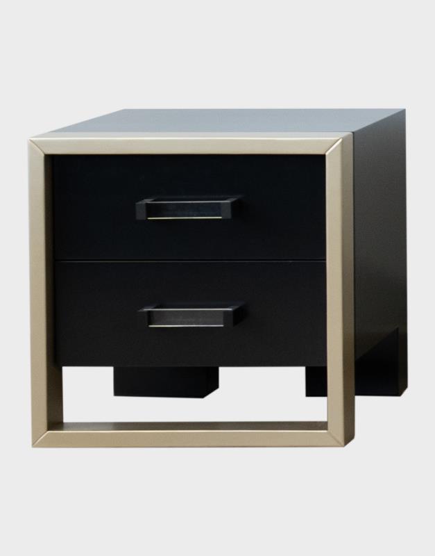 Buró fabricado en MDF de alta densidad combinado con refuerzos en madera solida de cedro, con terminado en pintura acrilica automotriz color negro y dorado, con jaladeras de acrílico.