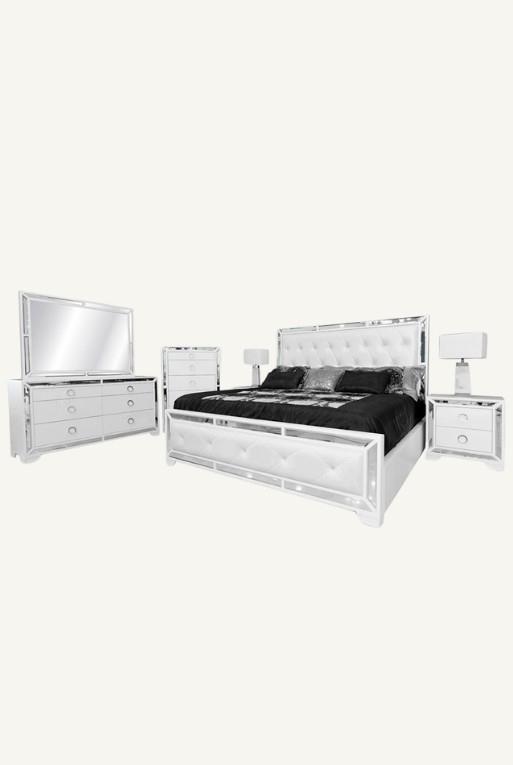 Cama fabricada en mdf, con madera poplar. Destaca por sus detalles en terminado espejo. Su cabecera está tapizada con tacto-piel de alta calidad, color perla.