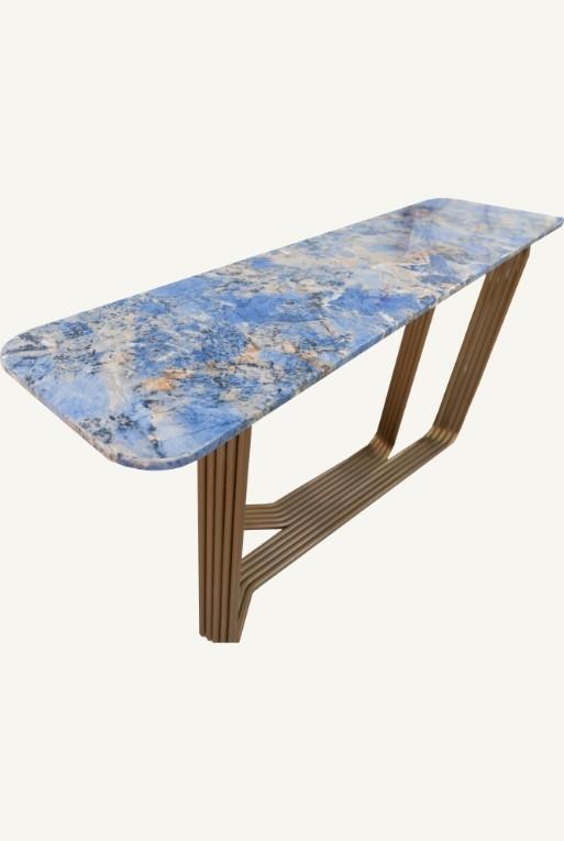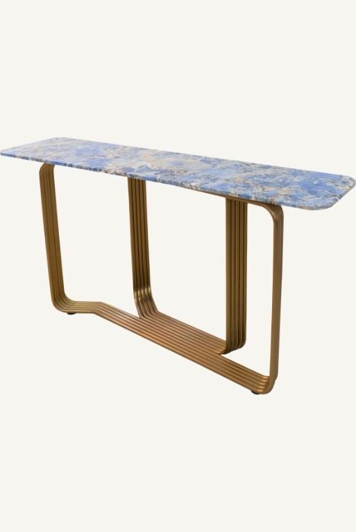 Consola con base de acero acabado color dorado y cubierta de cerámica con acabado tipo mármol azul.