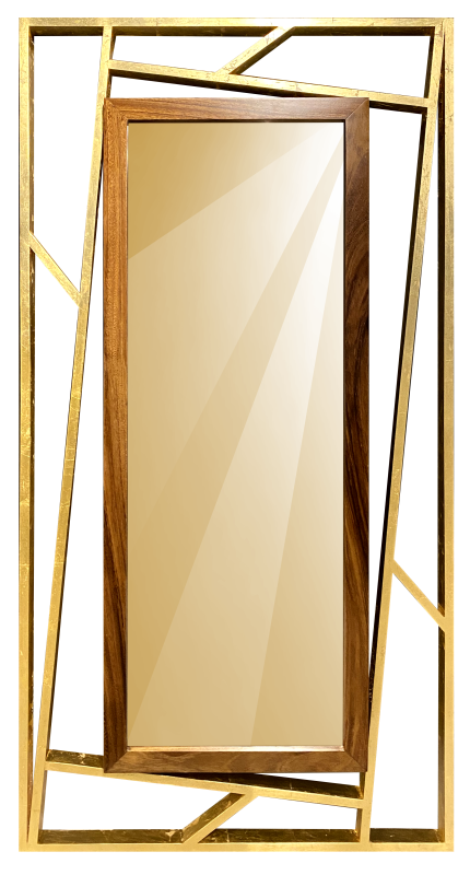 Espejo con marco de MDF y acabado en hoja de oro. Diseño geométrico moderno, perfecto para cualquier espacio.