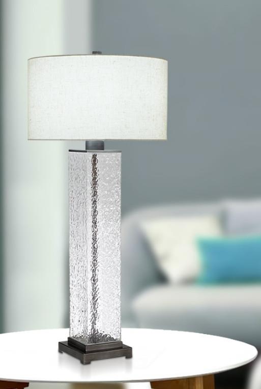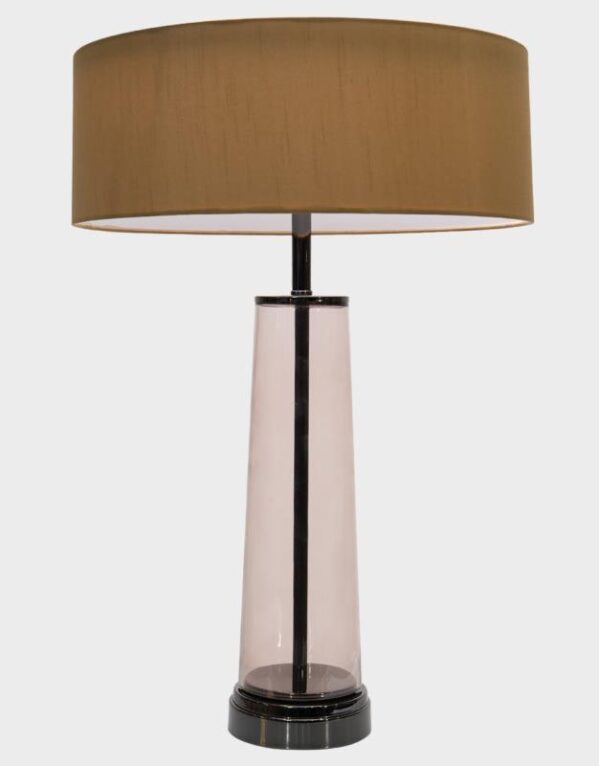 Lámpara hecha con base de metal y cristal, con pantalla de tela sobre estireno.