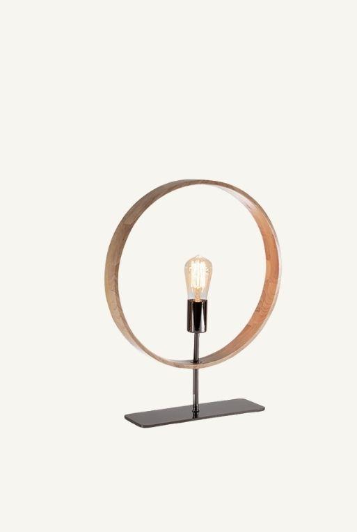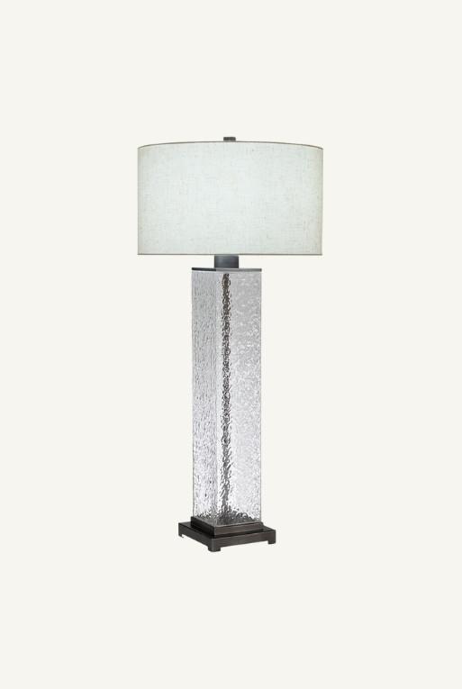 Lámpara hecha con base de metal y cristal, con pantalla de tela sobre estireno.