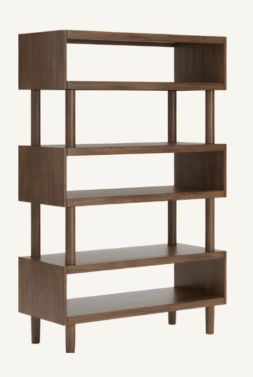 Este librero combina un diseño moderno con practicidad en una pieza única. Su cálido acabado en tono marrón roble envejecido realza cualquier espacio, mientras que su silueta geométrica de inspiración retro aporta un estilo distintivo y sofisticado. Con tres módulos apilados sostenidos por postes redondos, ofrece seis estantes ideales para organizar libros, objetos decorativos o accesorios de oficina. Fabricado en madera maciza, chapa de roble y MDF, es la elección perfecta para quienes buscan funcionalidad.
