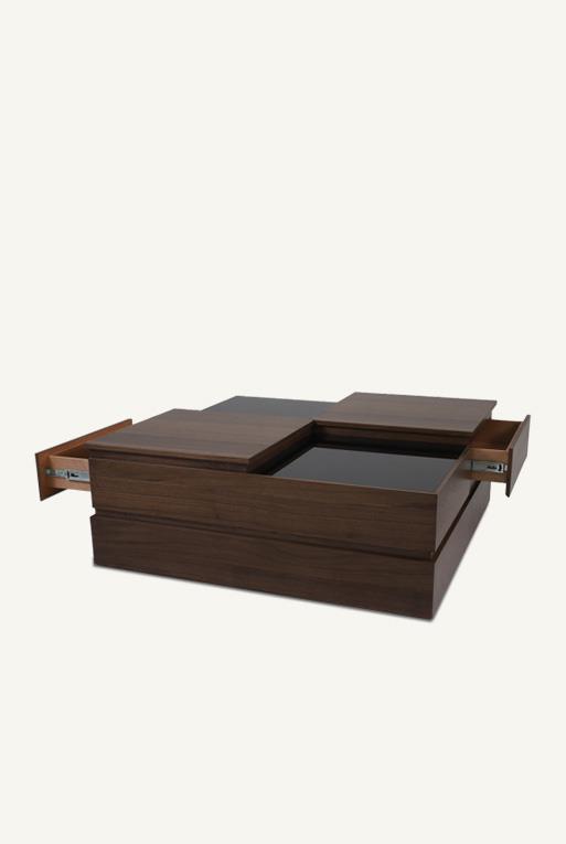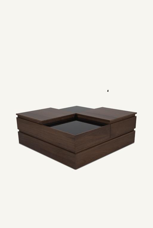 Madera nogal y cristal templado ahumado.