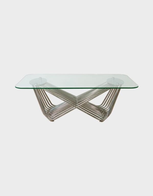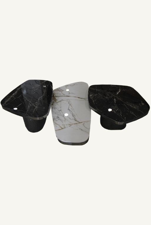 Juego de 3 mesas centrales, de importación con base de acero inoxidable y cerámica acabado tipo mármol.
