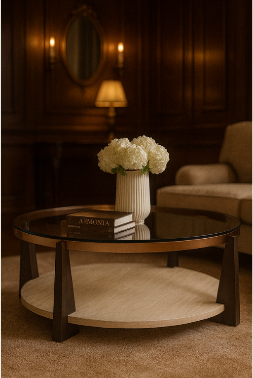 La mesa central Hanna está hecha con madera de nogal y cuenta con una cubierta de cristal templado ahumado.