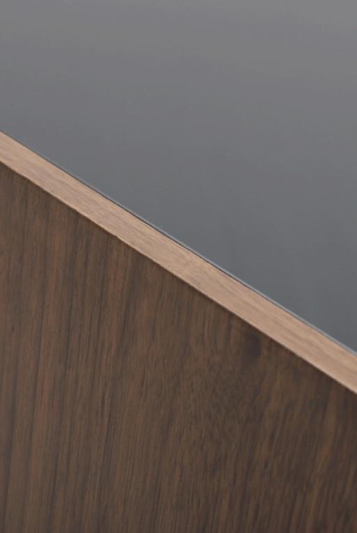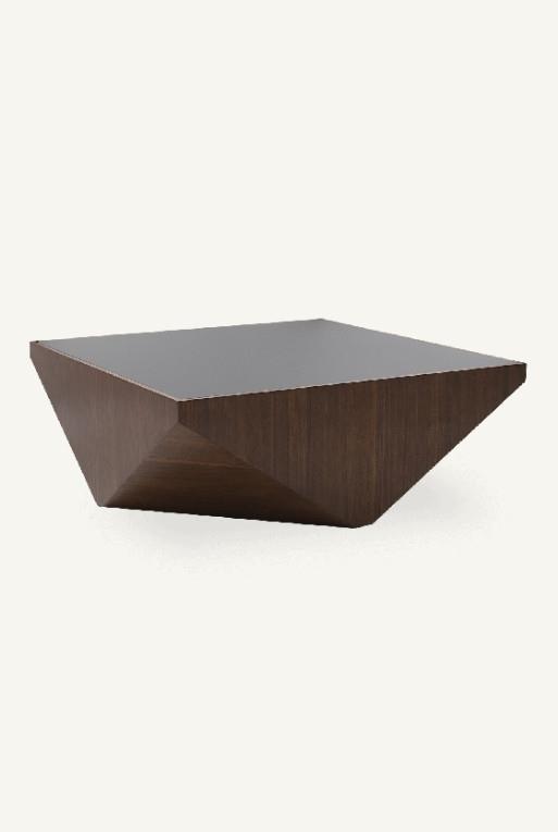 Mesa de centro Vittoria fabricada en madre de nogal. Destacada por sus cortes geométricos que la hace única.