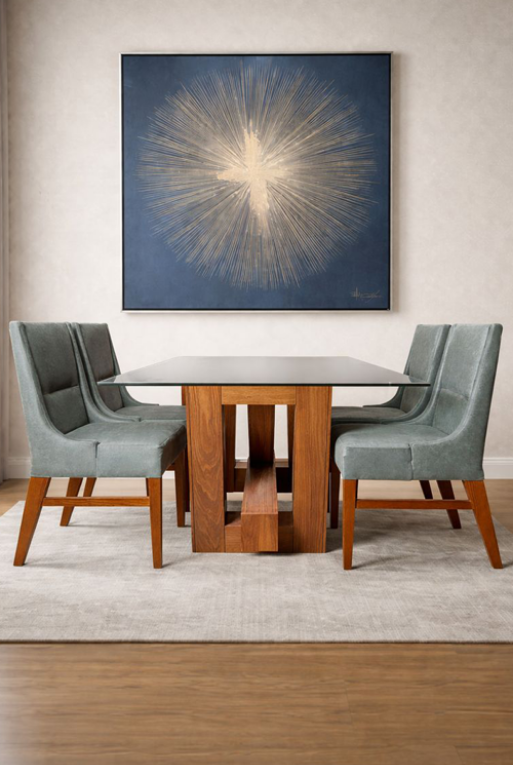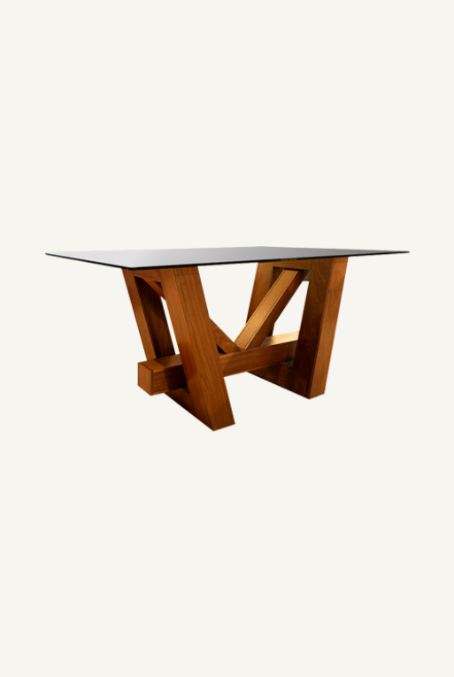 Mesa de comedor hecha con madera nogal. Cubierta de cristal templado.
