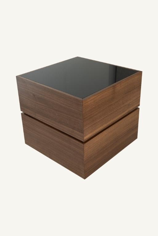 Mesa Lateral “Julia”, esta mesa combina madera de nogal robusta con cristal templado ahumado para un look contemporáneo. Ideal para salas de estar que buscan un toque de diseño limpio y práctico