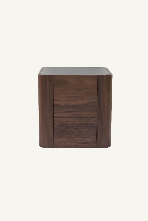 Mesa Lateral “Julia”, esta mesa combina madera de nogal robusta con cristal templado ahumado para un look contemporáneo. Ideal para salas de estar que buscan un toque de diseño limpio y práctico