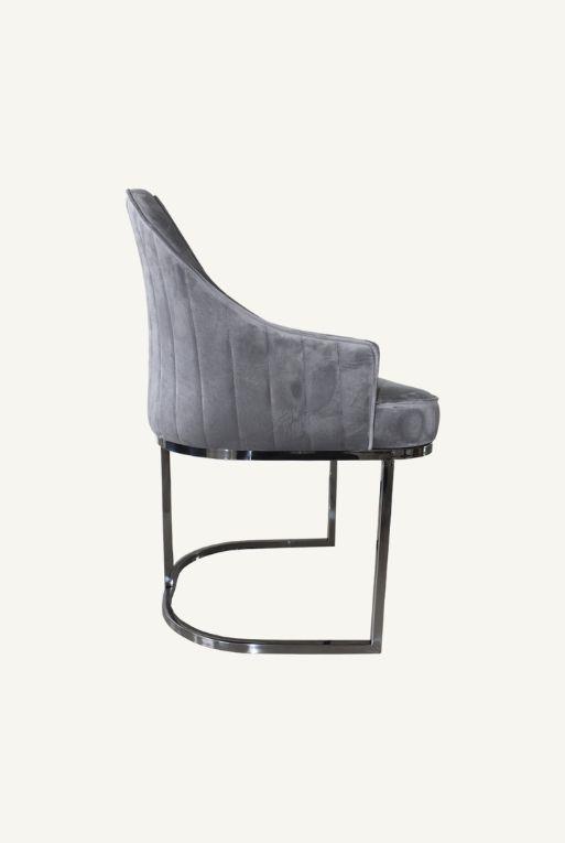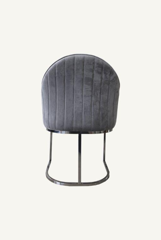 Silla de comedor de acero inoxidable, asiento hecho con tela tipo velvet color gris.