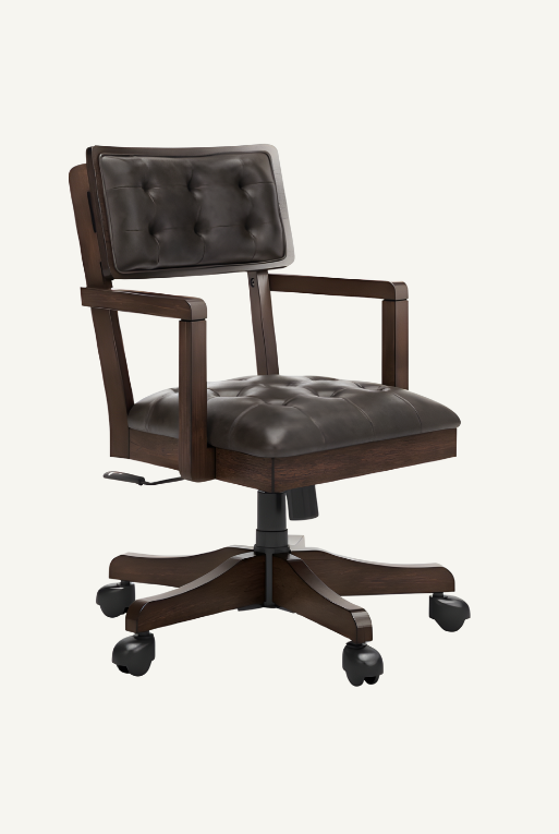 Esta silla de oficina clásica contemporánea combina el encanto atemporal con la comodidad moderna. Su estructura de madera maciza en tono marrón oscuro y tapicería capitoneada de piel sintética aportan elegancia, mientras que el asiento ajustable y el respaldo acolchado garantizan confort durante largas jornadas. Con ruedas giratorias para un desplazamiento sencillo, es la opción ideal para trabajar, estudiar o jugar con estilo y funcionalidad.