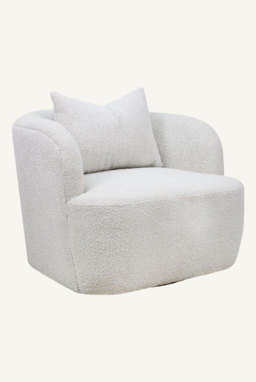 Sillón ocasional hecho con tela tipo bouclé color blanco giratorio.